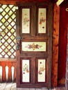 Следующий способ применим к дверям из цельного массива. Его суть заключается в том, чтобы прорезать небольшие отверстия в полотне и вставить в них разноцветные стекла.