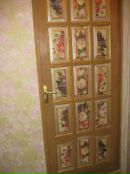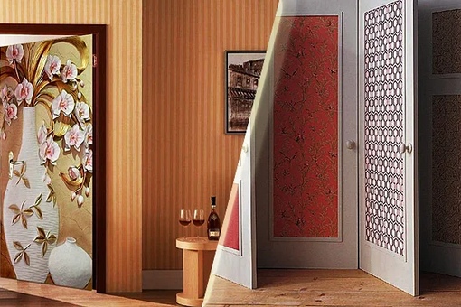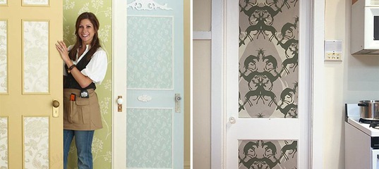 Этот способ обновления дверей понравится тем, кто не хочет возиться с краской. Для обновления двери с помощью обоев, фотообоев или ткани вам понадобится полотно. Самый распространенный способ обновления двери — фотообои. Этот способ особенно популярен в Европе. Выбор фотообоев для обклеивания дверей огромен. При помощи фотообоев вы можете сделать из старенькой двери настоящий шедевр, который не уступит даже дизайнерской двери. Обклеивая дверь фотообоями, учитывайте рисунок и его законченность. Процесс монтажа подробно описывается на упаковке. Выбирая ткань или обои, ориентируйтесь на общую цветовую гамму в квартире. Если дверь остекленная, вместо стекла можно вставить кусок фанеры, обклеив ее предварительно тканью. При обклеивании двери обоями с геометрическим рисунком, соблюдайте совпадение линий по вертикали.