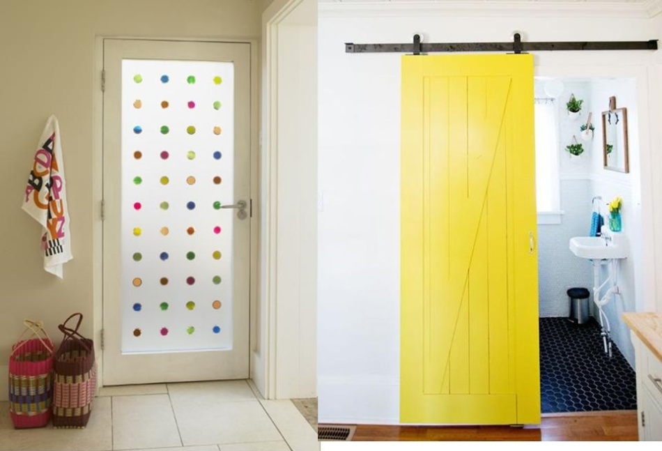 Далее можно для надежности обработать антисептиком, что особенно актуально для помещений с повышенной влажностью и прогрунтовать. Краску на ровное полотно наносят валиком, фигурные элементы проще промазывать кисточкой. Нужно следить, чтобы не образовались потеки. Можно сделать однотонное покрытие или нанести рисунок. В качестве декора используют камни, посаженные на клей, стеклышки, бусинки и прочие милые детали. Так как обновить дверь в кухню или ванную комнату другими способами вряд ли получится, покраска является оптимальным вариантом для любого случая.