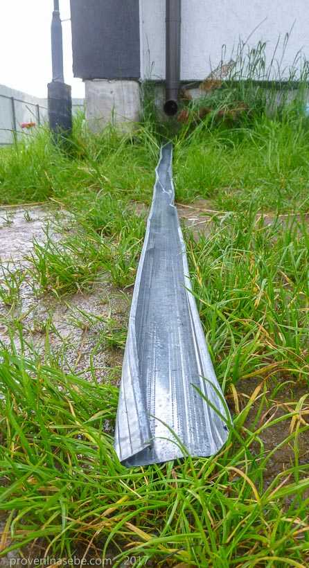 При написании этой инструкции я исхожу из того, что система стока с кровли уже есть. Имеются желоба и водосточные трубы. Задача — проложить дорогу воде по поверхности земли так, чтобы она не затекала под дом, а уходила куда-нибудь в безопасное место.