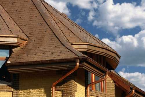 Медные желоба считаются самыми долговечными. Они изготавливаются из чистой меди без дополнительных покрытий. Соединяются между собой фальцем или пайкой. Чаще всего монтируются на фальцевых медных кровлях. Со временем медь окисляется, приобретая зеленоватый оттенок, а позже – почти малахитовый. Это так называемая патина – оксид меди. Она придает всей кровле некую изысканность. На общем фоне такой кровли желоба и водосток не будут выделяться вовсе, как бы являя собой одно целое с крышей.