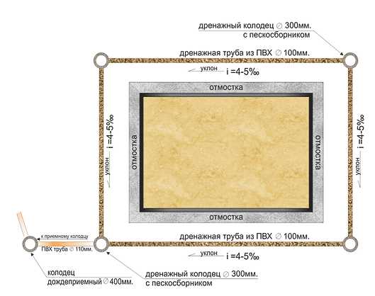 Первым делом обеспечивают водоотвод с кровельной конструкции. Для этого скаты оснащают желобами, по которым влага беспрепятственно спускается вниз, проходя через ливневые трубы. Внизу располагают дождеприемники, закрытые решетками (исключают попадание сора). Такие приямки сообщают с отводящей системой труб и бетонируют.