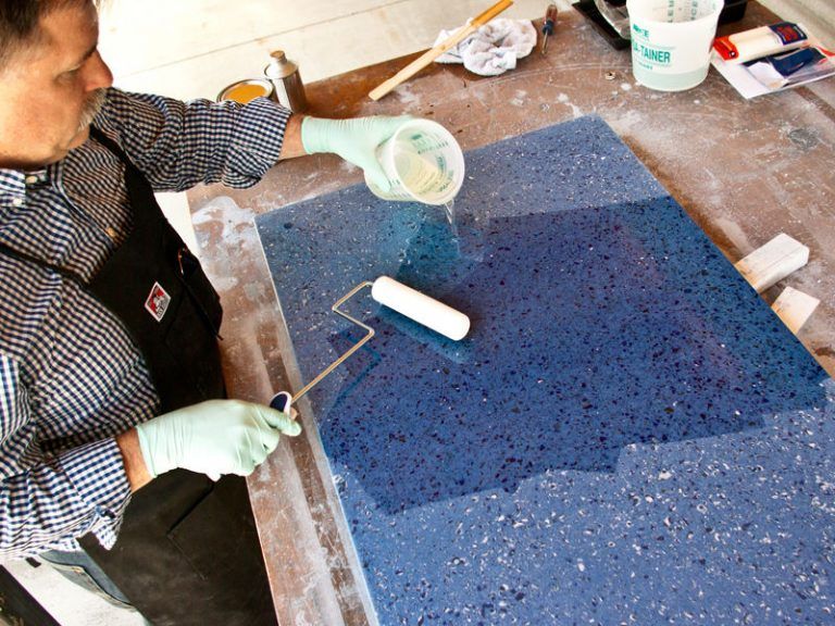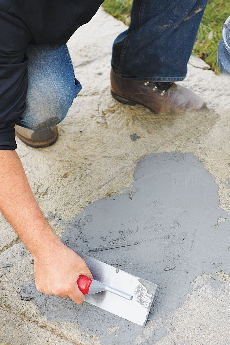 - Если вы решились на ремонт своими руками, не рискуйте, смешав сразу весь материал с красителем. Пробный замес с последующей заливкой помогут выявить все возможные проблемы.