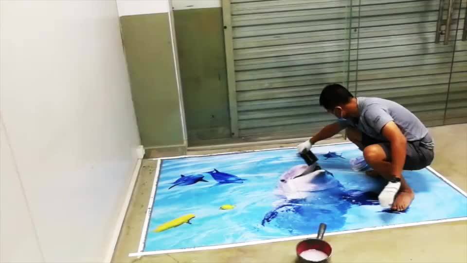 Если вы хотите получить объемную картинку на полу, то между этими двумя шагами сделайте следующее: выбранный рисунок печатается на специальной пленке, которая закрепляется на «рубашке» первого слоя.Затем залейте рисунок финальной прозрачной композицией.