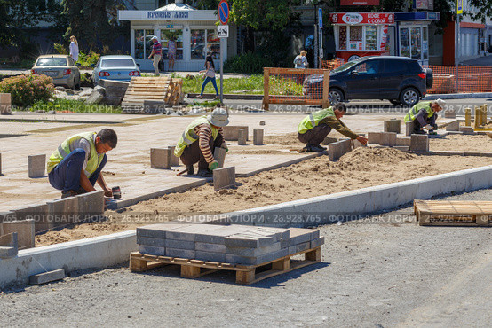 Однако, правильнее не отвлекаться на мелочи, и подгонять сложные участки после окончания основной укладки.После того, как закончена основная укладка тротуарной плитки и подгонка сложных участков, швы между плитками засыпают мелким и чистым песком (0,5 мм) без солей и органических примесей, которые могут вызвать появление на поверхности плитки «засолов». Песок затирают в швы шваброй с жёстким ворсом.
