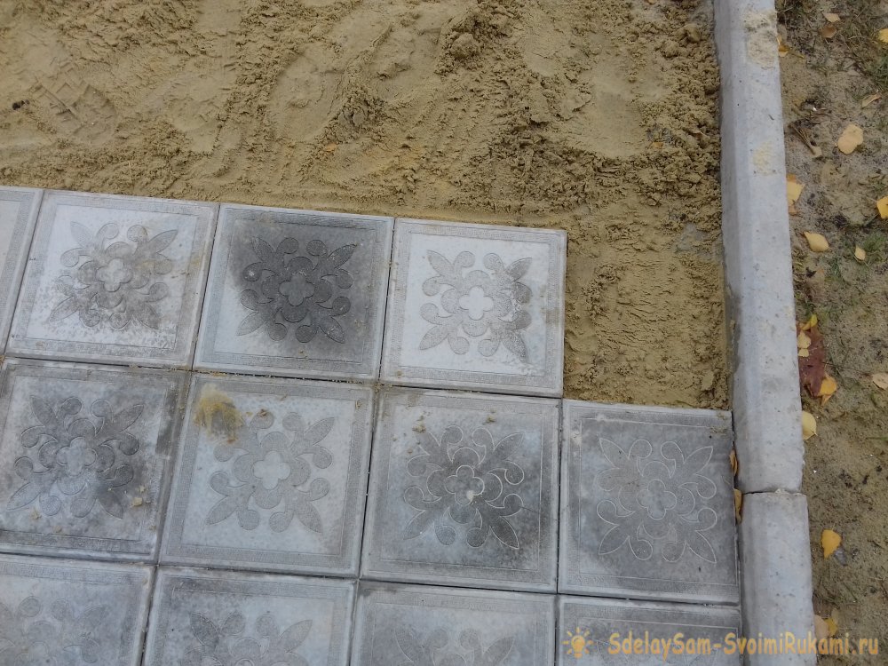 Две ровные трубы укладывают по шнуру и по уровню на расстоянии длины правила между собой. Затем выравнивают подсыпку, передвигая правило по маякам. При наличии заранее установленных поребриков, их также можно использовать как маяки. В этом случае в торцевых краях правила вырезают выемки по толщине плитки.Плитка на подготовленную основу выкладывается по конструктивному или, если она допускает различные способы укладки, по задуманному мастером узору. Чтобы не путаться, целесообразно заранее потренироваться, собрать узор где-то в стороне на ровном месте.