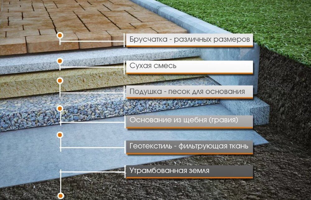 Для пешеходных дорожек достаточно толщины слоя 10-15 см, если предполагается движение транспорта, то толщина должна быть хотя бы 15-20 мм, иначе покрытие просядет. В общем случае — чем толще слой, тем выше несущая способность покрытия. На сухих песчаных грунтах, которые незначительно реагируют на перепады температуры, основной слой можно укладывать непосредственно на дно выемки. На глинистых грунтах, склонных к вспучиванию, предварительно насыпают морозозащитный слой из мелкого гравия с фракцией 5-20 мм. Его толщина должна быть не менее 10 см. Верхний, подстилающий слой песка с зерном 1,5-2 мм или отсева укладывают на несущий. Толщина верхнего слоя основания 4-7 см. Непосредственно под плитку насыпают ещё до 5 сантиметров песчано — цементной смеси.