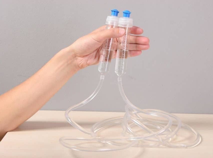 - Чтобы ускорить процесс, можно втянуть воздух из нижней трубки.
