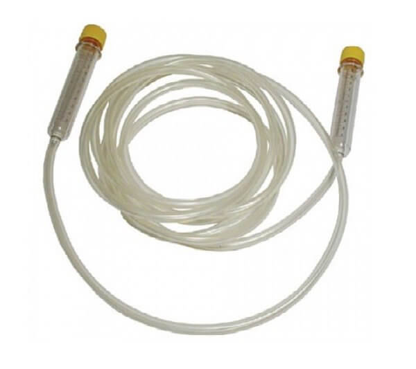 На его концах располагаются сосуды с нанесенной на стенках сантиметровой градуировке. При определении, следует расположить столбики воды в колбах на одинаковой отметке. Но колбы с разметкой часто снимают за ненадобностью, можно просто разметить по 1 риске на концах шланга и работать так.