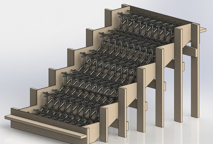 Опалубка монолитной лестницы на косоуре со ступенями из бетона. Арматурный каркас консольных ступеней из бетона соединен с арматурой косоура.Железобетонные косоуры лестницы также, как и лестничные марши, могут устанавливаться или между межэтажными перекрытиями, или между перекрытием и промежуточной лестничной площадкой.