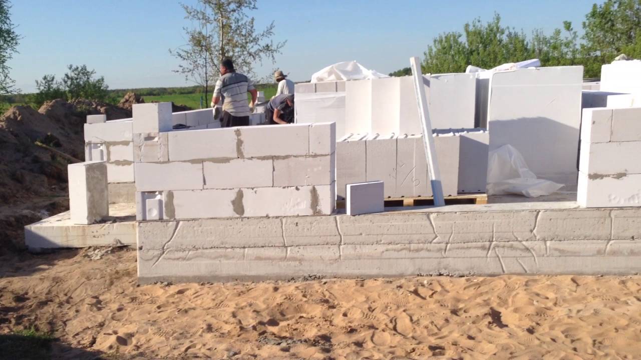 Первый ряд должен быть уложен качественно и ровно, так как от этого зависит качество всей кладки. Второй ряд укладывают так, чтобы блоки переплетались, как и при кладке кирпича. Все выступы на блоках необходимо удалить с помощью шлифовальной терки, а для перевязки внешней стены с внутренними, следует удалить пилой четвертую часть блока наружной стены.