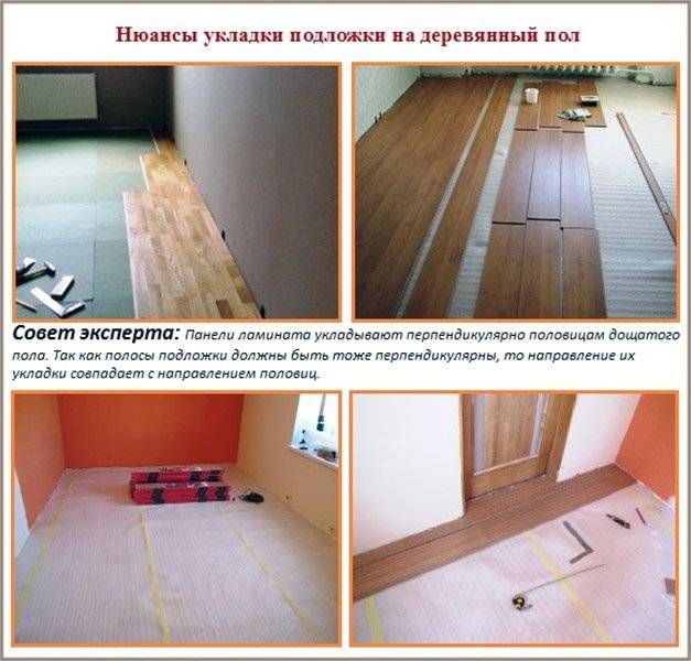 Подложка должна иметь толщину не больше 2-5 мм. При этом в случае с рулонными материалами стыки располагают перпендикулярно направлению досок. Листовые лучше укладывать диагонально, в шахматном порядке или смещая швы в каждом ряду.