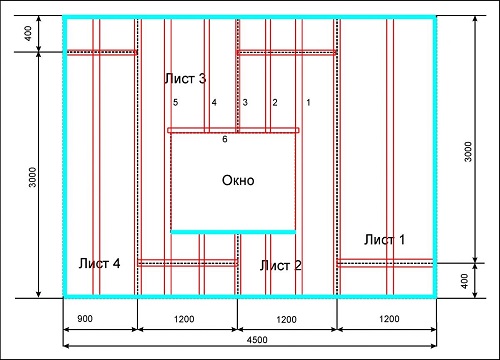 Разметку выполняют с таким расчетом, чтобы минимизировать число стыков и симметрично приклеить целые ГКЛ.