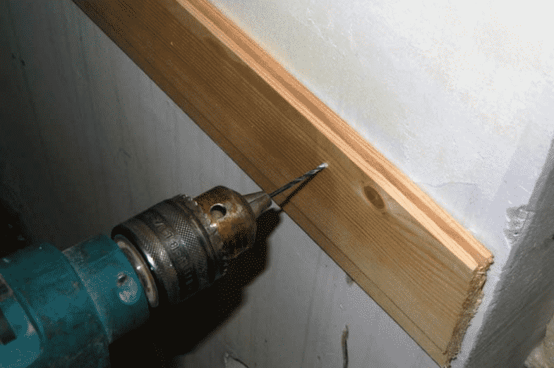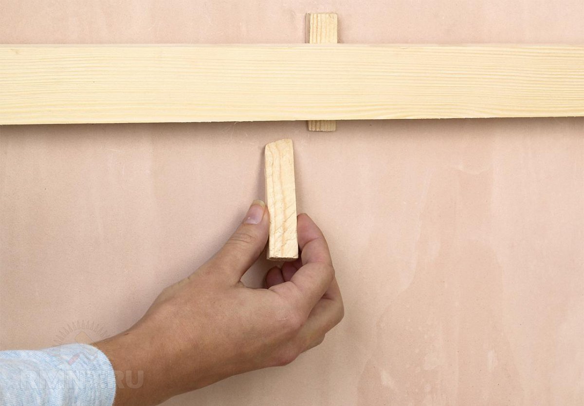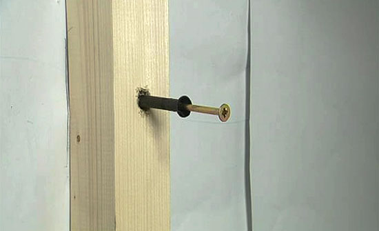 Теперь эту разметку следует повторить на поверхности стены в местах предстоящего крепления. В брусе сверлят сквозные отверстия, а затем, приложив просверленный брус к стене, делают отверстия в ней. Затем вводят (вбивают) в них пластиковые дюбеля и вкручивают шурупы или вставляются специальные гвозди для быстрого монтажа и вбиваются молотком.
