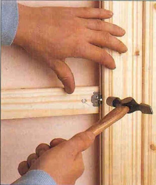 - В завершение работы в дюбеля вставляются гвозди и забиваются молотком. В результате крепежи расширяются и прочно фиксируются в стене, удерживая при этом деревянную деталь.