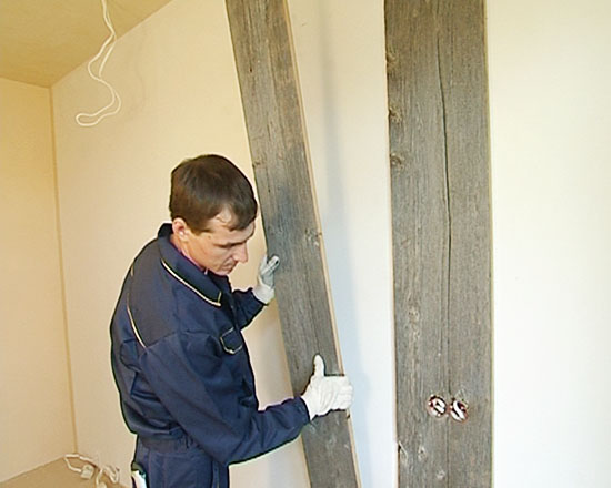 - Вначале нужно найти положение, в котором должен находиться прикрепленный к стене брус.