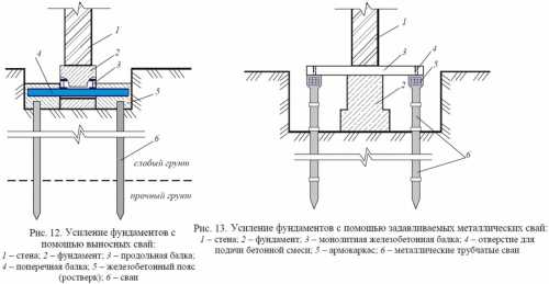 На подвижных грунтах (песок или супесь) строя новый фундамент, углы старого укрепляют сваями, заглубленными в почву не менее, чем на 100 см.