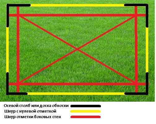 Важно: Правильность всех замеров следует обязательно проверить. Для этого между вбитыми кольями по диагоналям натягивают два шнура и связывают в месте пересечения
