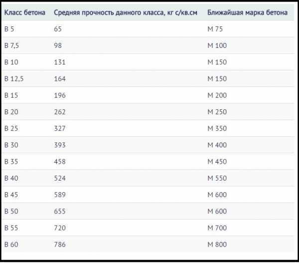 Основной характеристикой бетона является его прочность на сжатие. Не будем вдаваться в подробности о том, как оценивался на прочность бетон в разные времена, и остановимся на современной, используемой повсеместно, системе. Прочность бетона выражается в мега паскалях (МПа), которые определяют давление, выдерживаемое определенным классом бетона. На основании прочности бетон подразделяется на марки. В странах СНГ согласно ГОСТу классы обозначаются как В7,5 – В80. Различие зависит от типа используемого цемента (М300-М600), песка и фракции, а также породы щебня. Цифра в названии класса обозначает давление в Мпа, которое бетон выдерживает в 95% случаях.