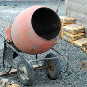 Для облегчения процесса используются компактные бетономешалки, которые можно взять напрокат. В барабан машины загружают половину объема наполнителя и наливают воду. Затем поочередно порциями добавляют цемент, песок и остатки щебня или гравия. Состав должен перемешиваться в течение нескольких минут. Далее, наклонив барабан, отливают небольшое количество полученной смеси в тачку. Если материал не готов, операцию продолжают.