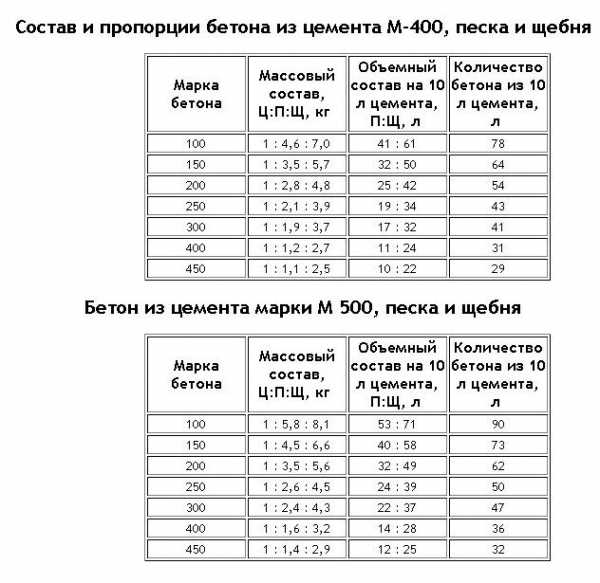 Существуют таблицы, по которым из определенной марки цемента можно получить необходимую марку бетона. В быту такими таблицами редко кто пользуется. Чаще вступает в силу такой расчет пропорции ингредиентов. Для марки цемента М400 за коэффициент берется число 4 (а для марки М500 — 5). Далее производим такой расчет: на количество цемента берется количество песка, равное массе цемента, умноженной на коэффициент. Масса заполнителя должна быть на 5-10% больше общей массы песка и цемента. При такой пропорции вы получите бетон марки М150. При уменьшении коэффициента на 0,5 вы автоматически увеличите марку получаемого цемента на 50 единиц.