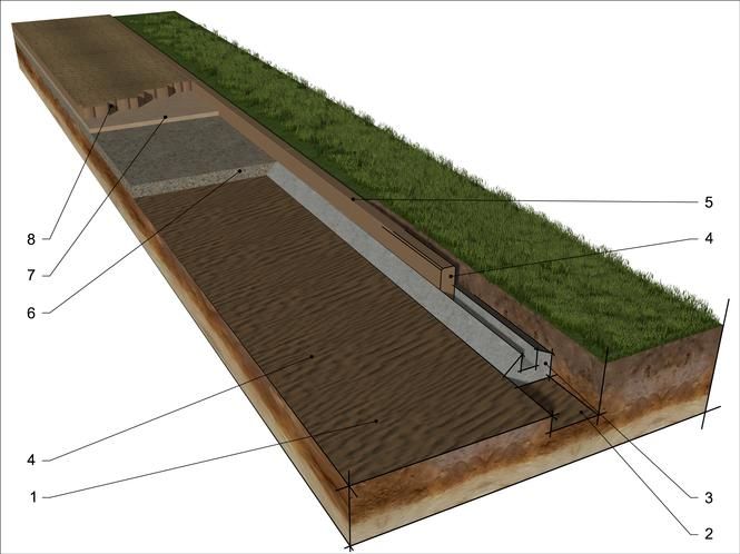 Это слой из щебня и песка, который выравнивает основание под будущим бордюром и обеспечивает ему устойчивость. Но прежде всего на дно траншеи выстилается геотекстиль (от 160 г/см2). Без него щебень и песок просто уйдут в грунт.