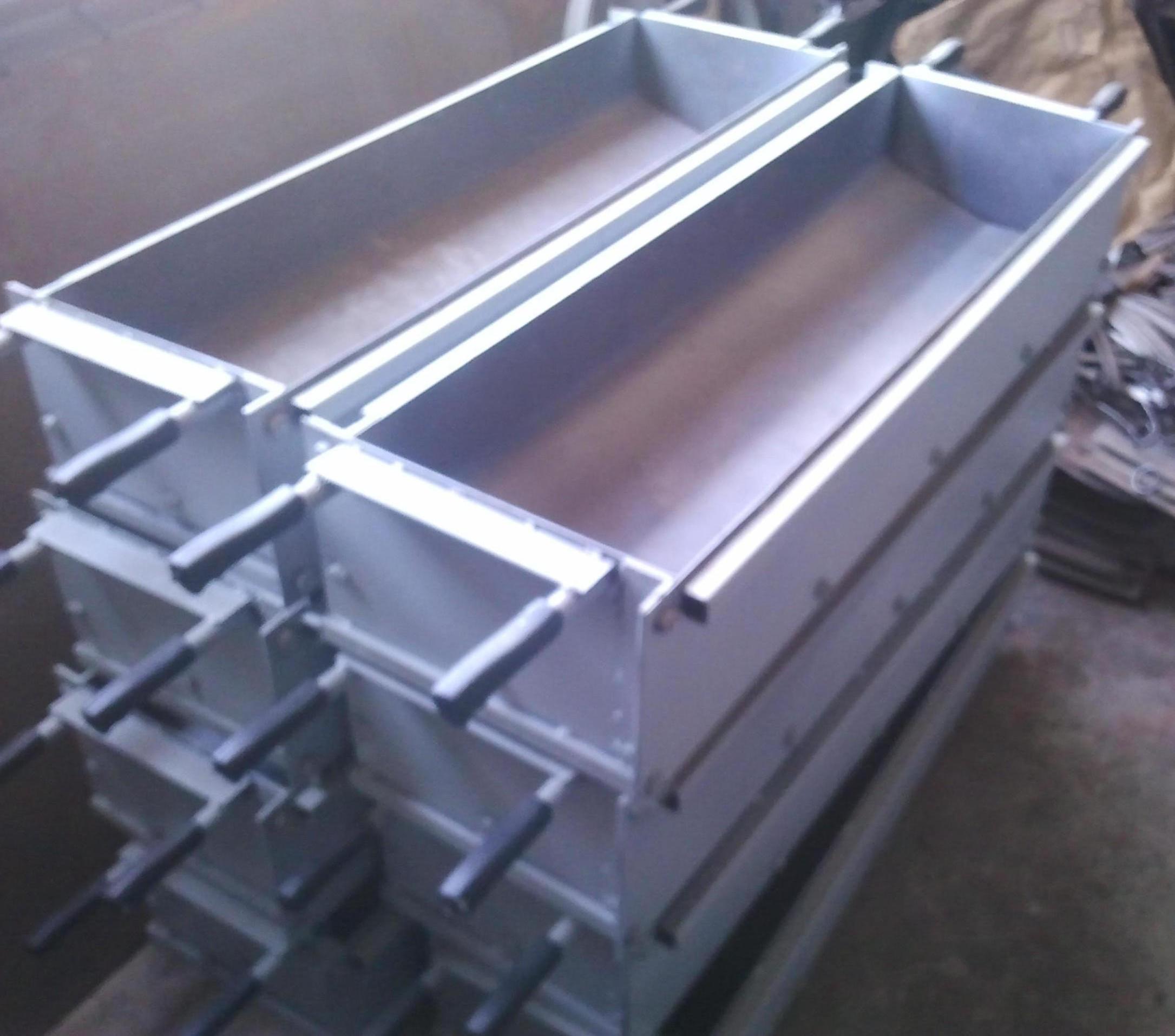 Кассетная форма устанавливается на опорной раме. На ней располагаются специальные детали, уплотняющие бетонный раствор. Конструкция имеет поддон, откидные борта и лотки.