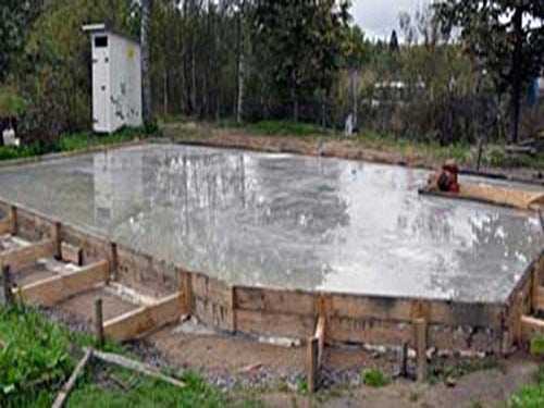 8. По периметру плиты укладывается тщательно закрепленная опалубка. Производится заливка бетона с утрамбовкой его вручную или при помощи глубинных вибраторов. Поверхность бетона заглаживается и выравнивается.