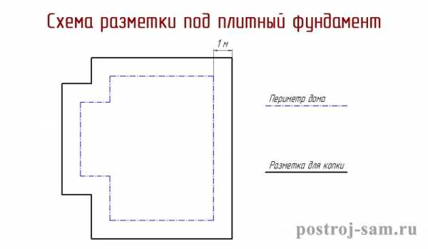 - Плитный фундамент размечается, в каждую сторону, на метр шире, чем периметр дома. Это необходимо для того, чтобы осуществить дренажную систему и отмостку.