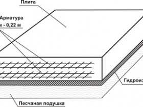 3. Монолитная фундаментная плита из железобетона укладывается на 10-30-сантиметровую «подушку» из песка и щебня, которая служит для дополнительной амортизации строения и предохранения основания от влаги. «Подушка» укладываются послойно, при этом каждый слой проливается водой и трамбуется.