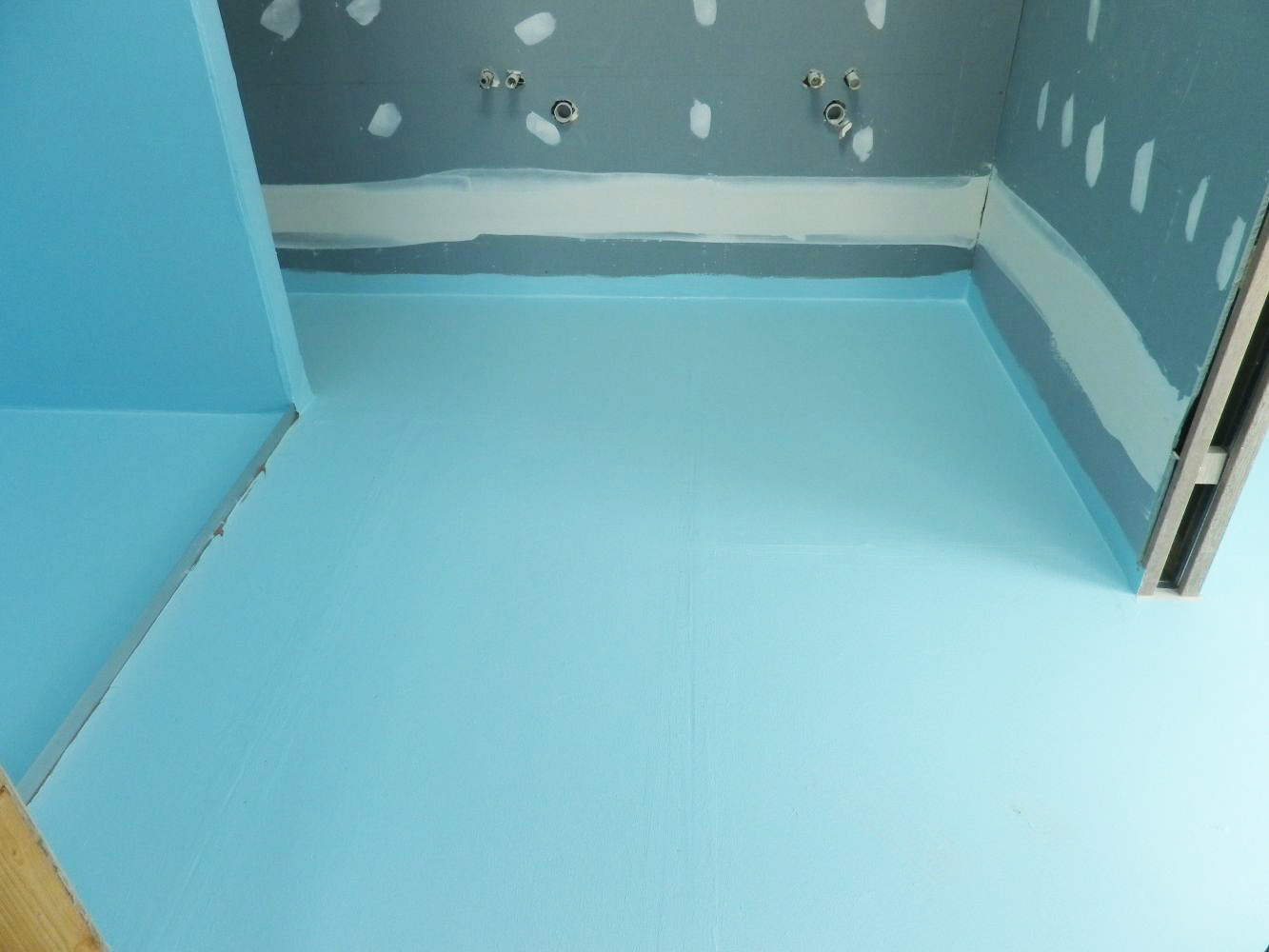 - Гидроизоляция уже нанесена на пол и по этому нам достаточно протереть влажной ветошью, а использовать грунт глубокого проникновения – GLIMS PrimeГрунт уже нет необходимости.