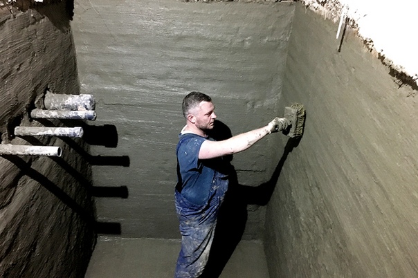 Затем согласно инструкции готовится раствор для стен и пола, например, «Пенетрон», и наносится кистью или валиком слоем от 1 – 2 мм.