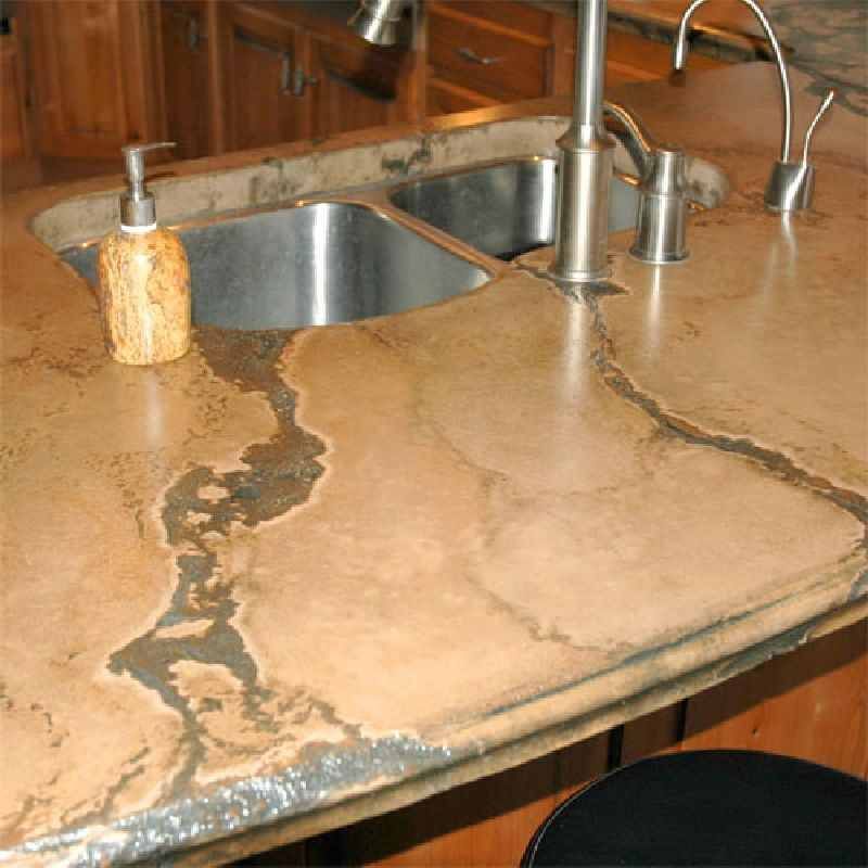 При необходимости в раствор можно добавить специальные красители. Готовый раствор заливаем в опалубку, выравниваем шпаталем и ждем, пока он полностью высохнет. Обычно на это уходит неделя-полторы. Затем убираем бортики, шлифуем столешницу, либо обклеиваем ее плиткой, либо придаем бетонной поверхности эффект мраморного покрытия.