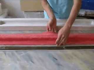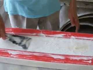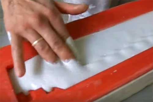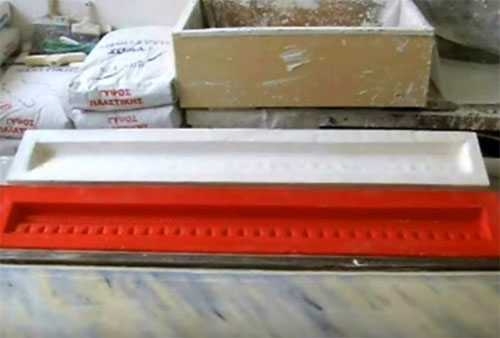 Процесс изготовления гипсовой лепниныПолученным составом заполняют подготовленную форму, заранее промазывая кистью всю внутреннюю поверхность шаблона. Если в распоряжении есть специальный вибростол или другое соответствующее оборудование, то можно дополнительно выполнить процесс вибрирования для удаления лишних пузырьков воздуха. Это помогает избежать появления раковин в гипсовом составе и на лицевой поверхности готовых изделий. После наполнения формы тыльную часть лепнины нужно тщательно выровнять шпателем.