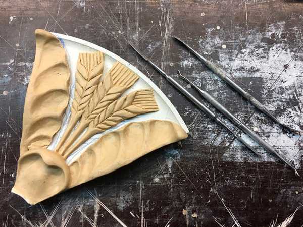 Техника плоской лепки из гипса показана на подборке фото ниже. Правила здесь такие. Первое, материал густоты теста или жирной сметаны наносится слоями. Второе, каждый слой сначала разглаживают, формируя заодно и рельеф, а затем подравнивают его контур. Третье, следующий слой, как и вообще в послойном заполнении гипсом, наносят на схватившийся, но еще влажный предыдущий. Четвертое, по мере наращивания слоев переходят на более мелкий инструмент. И пятое, в каждом слое работу ведут от самых тонких и мелких деталей к толстым и грубым. В данном случае – от зубчиков листа к его черешку.