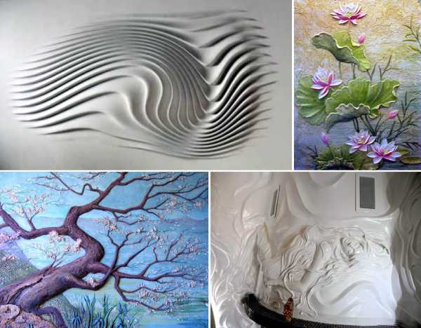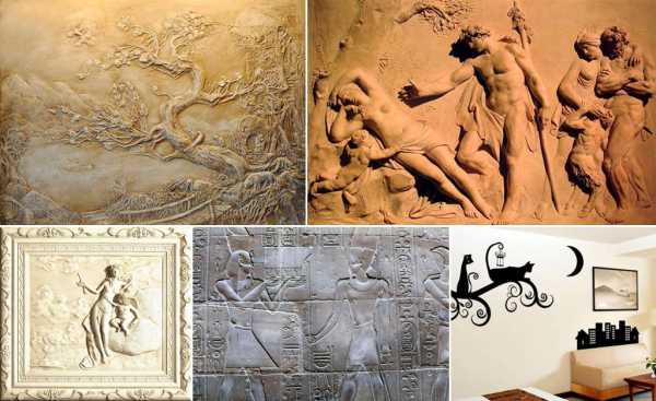 В жилых помещениях, освещенных чаще всего достаточно ярко и равномерно, имеет смысл использовать смешанную технику барельефа (слева внизу), не делая фигуры очень уж выпуклыми. Как вылепить барельеф «Дерево Климта», см. напр. видео мастер класса ниже:
