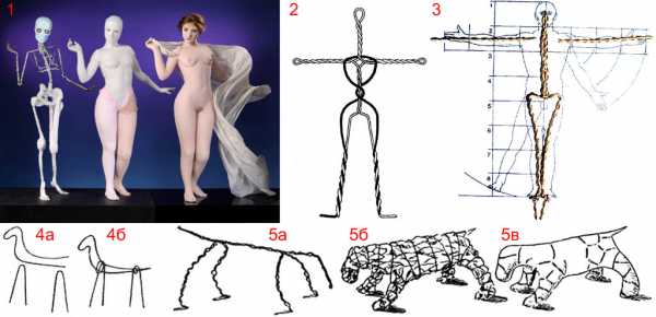 Основа круглой лепки – анатомически подобный объекту проволочный каркас, т.е. с пропорциями объекта и расположением ветвей там, где основные кости костяка. Каркас в круглой фигуре работает так же, как скелет живого существа. Сведения о скелетах можно почерпнуть из любого курса пластической анатомии человека, животных и птиц. Пластическая анатомия дисциплина не медицинского, а художественного образования. Материал там изложен с точки зрения, как лепить, а не как лечить, и рассчитан на слушателей, к тонкостям и строгостям науки не расположенным.