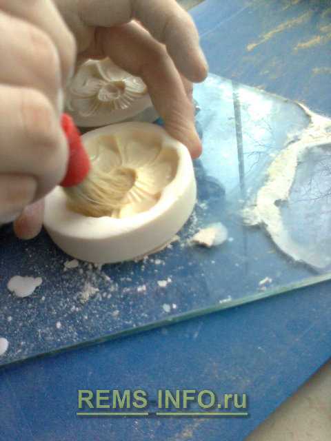 Вам необходимо удалить с её лицевой поверхности грязь, пыль и посторонние предметы. После используем разделительную силиконовую смазку. Ранее мы использовали её для отделения копируемого элемента от силиконовой формы, сейчас же будем отделять от формы уже, непосредственно, само гипсовое изделие. Промазывать следует тщательно, не оставляя пропусков.