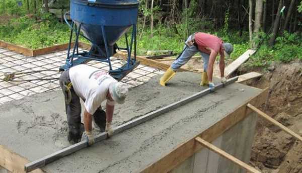 - Бетонный раствор равномерно заливают в опалубку без перерывов. Раствор уплотняют деревянными трамбовками, чтобы не было пустот в толще конструкции.