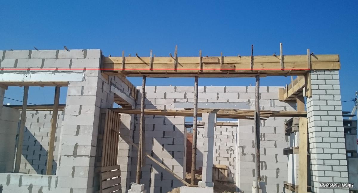 Данный способ создания бетонной перемычки на газобетон является самым дешевым, однако требует немало хлопот. В результате, получается довольно крепкая конструкция, выдерживающая большие нагрузки. К недостаткам можно причислить тот факт, что после ее монтажа, теряется однородность поверхности стены, что обнаруживается при нанесении тонкого слоя штукатурки. До начала работ по устройству монолитной балки, требуется соорудить съемную опалубку из фанеры, досок или другого аналогичного материала.