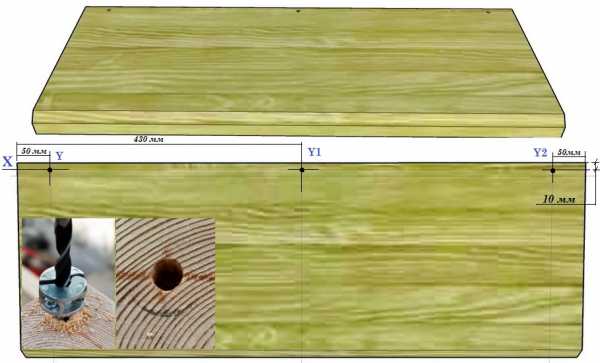 От тыльного торца ступени отмеряем 10 мм и проводим ось Х. От левого торца отмеряем 430 мм, середина ступени и проводим ось Y1. Боковые отверстия размечаем следующим образом — от левого и правого торца отмеряем по 50 мм и проводим ось Y и ось Y2. На пересечении осей Y с осью Х ставим отметки, которые служат центром отверстий.