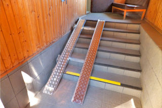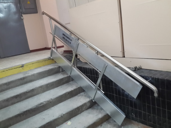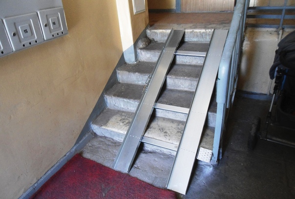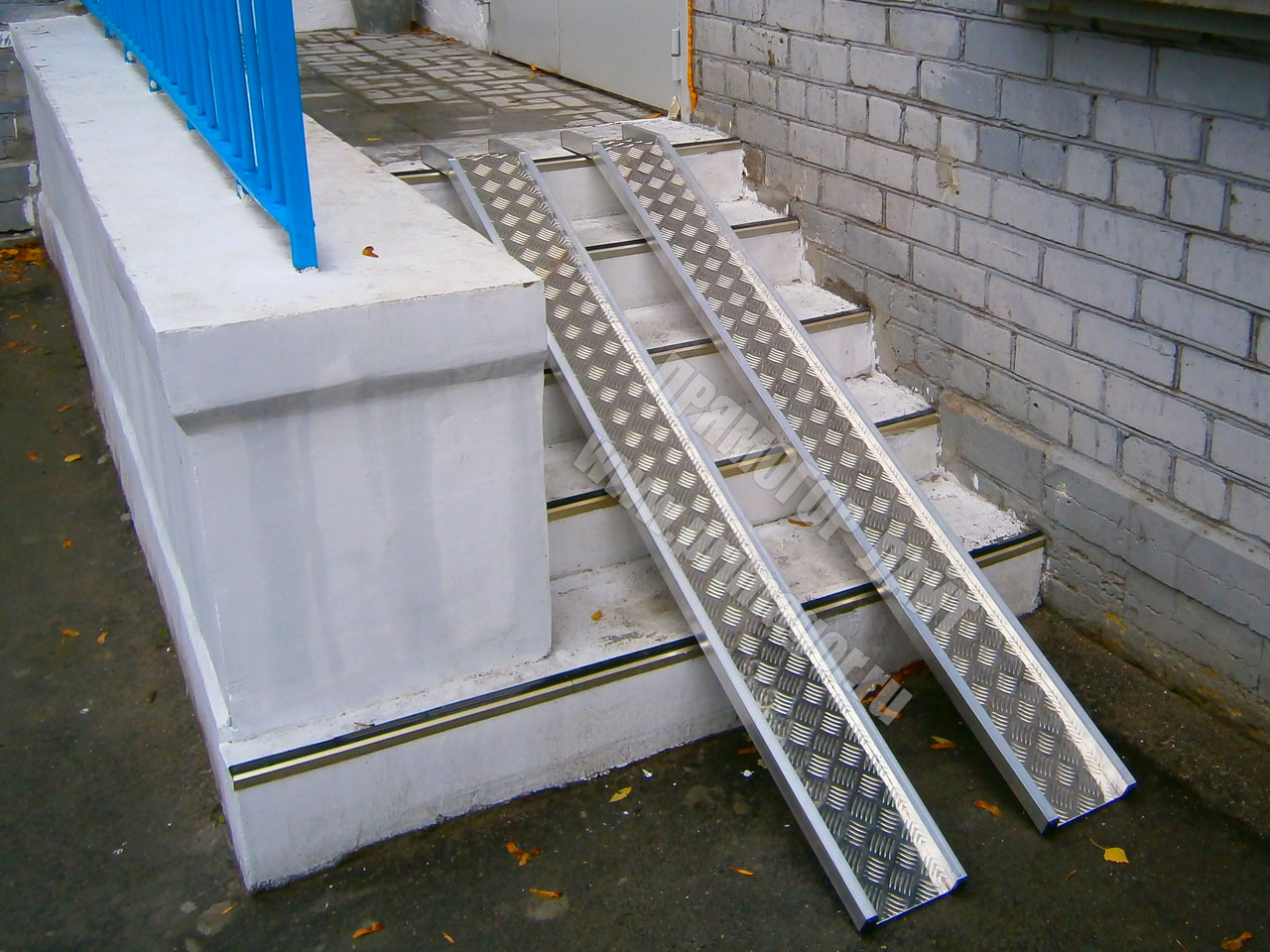 - Представляют собой изделие из двух раздельных секций, изготовленных, как правило, из металла. Каждая рельса имеет небольшие бортики, а также покрыты специальным противоскользящим материалом. Такие сооружения считаются наиболее легкими и мобильными, но если подъем имеет большую крутизну, то подниматься в инвалидном кресле по нему самостоятельно не рекомендуется.