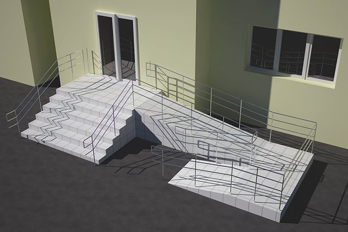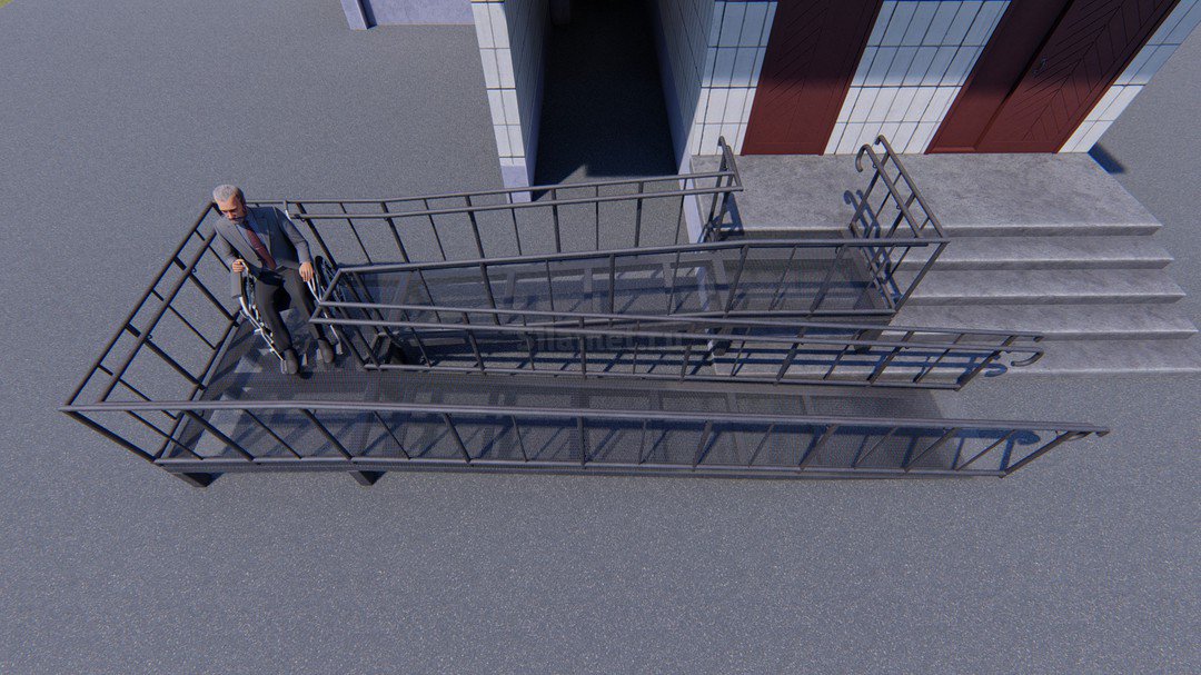 - Как правило, такие изделия состоят из трех основных элементов – две горизонтальные площадки (в начале и в конце), а также наклонная поверхность (марш). Очень часто при проектировании забывают о том, что площадки при спуске и подъеме должны свободно вмещать инвалидное кресло, иначе воспользоваться данным изделием люди с ограниченными двигательными функциями просто не смогут.