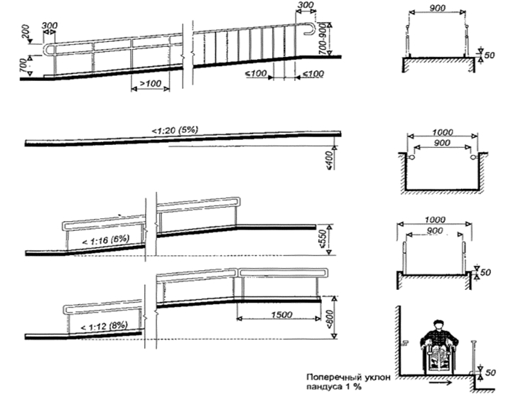 - Направляющие рельсовых пандусов должны свободно вмещать стандартные колеса инвалидных кресел или детских колясок.