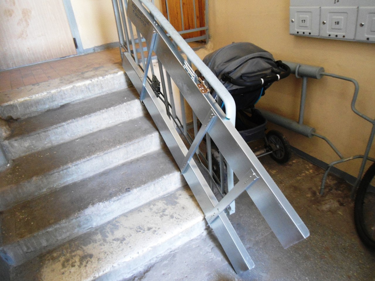 - Внешне они похожи на стационарные пандусы и их назначение практически идентично. Основное отличие заключается в том, что данные конструкции имеют откидной механизм. В собранном виде освобождается лестничный марш. Применяются внутри подъездов в многоэтажных домах, а также в частных строениях. То есть там, где место является ограниченным и применение стационарного пандуса невозможно, так как стало бы помехой для свободного перемещения людей.