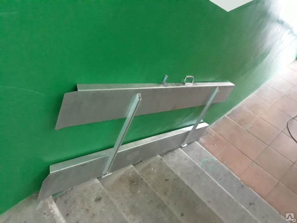 - Откидной пандус имеет вид рельсов или платформы. С одной стороны закрепляется к стене или перилам, которые располагаются вдоль лестницы, при помощи специальных замковых соединений, либо простых строительных петлей и щеколд. Вторая сторона остается свободной и конструкция беспроблемно может опускаться и подниматься.
