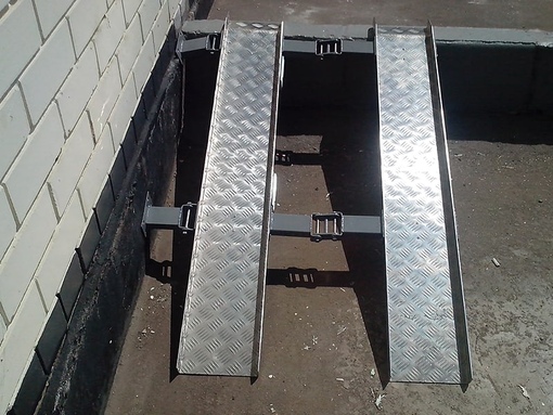 - Внешне представляет собой две параллельные аппарели. Вообще, термин аппарель заимствован из военного дела, где так называют специальные приспособления, позволяющие грузить тяжелую технику (автомобили и даже танки) для перевозки в железнодорожных составах. Модели раздвижных пандусов на сегодняшний день самые разнообразные, отличия между ними заключается в длине направляющих и в их ширине. Также важным показателем считается грузоподъемность изделия. Приблизительная возможная нагрузка на пандус в собранном виде составляет 400 кг.