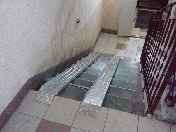 Чтобы совершить подъем или спуск по такому пандусу, достаточно просто раскрыть замковый механизм и уложить платформу на лестничный марш. Когда необходимость в них исчезает, они также спокойно возвращаются на место, вновь закрепляясь замком.