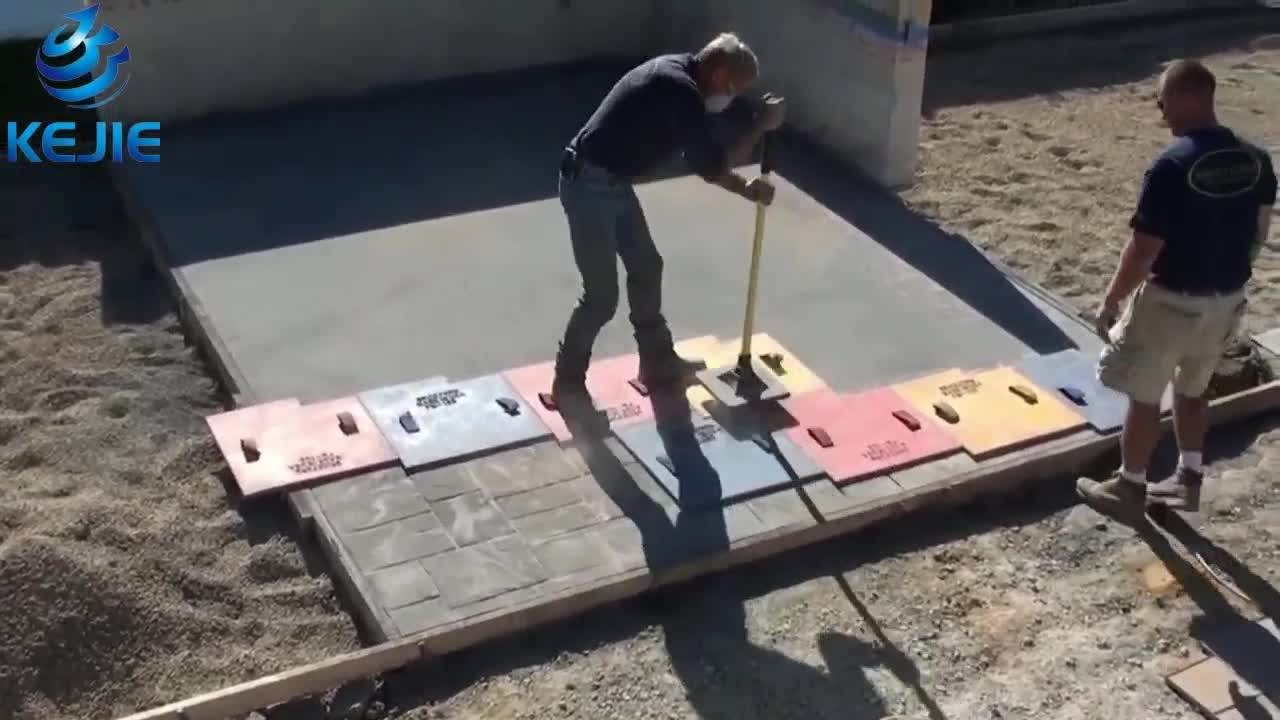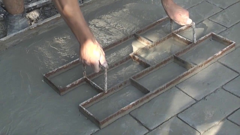 Специальные формы штампов выкладываются на бетонную поверхность, а сверху стучат специальным молотком. Это необходимо для того, чтобы рисунок с формы штампа лучше отпечатался на бетоне.