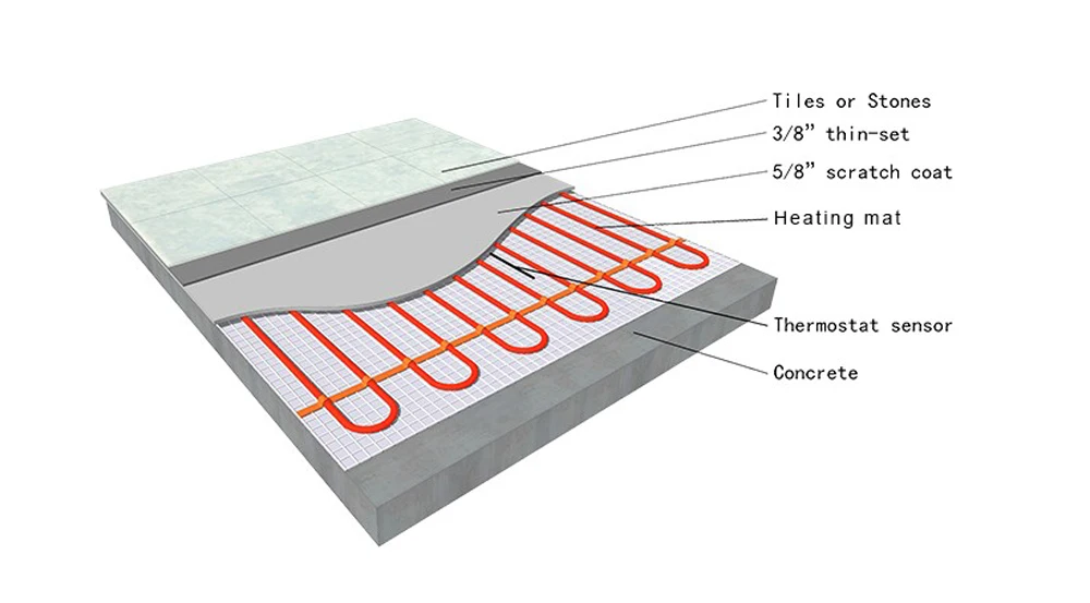 - после проверки правильности укладки, подключения термодатчиков, отсутствия повреждений заливаем цементную стяжку толщиной 30-40 мм;